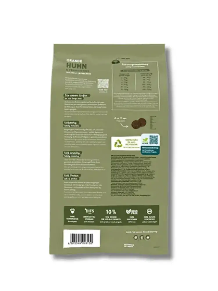 Свежее мясо курицы (20 %), ячмень, кукуруза, белок из птицы(сушеный), животный жир, белковый гидролизат, кукурузный белок, рисовая мука, горох (сушеный, 0,8 %), мука, карбонат кальция, масло лосося (0,5 %), хлорид калия, ягоды брусники (сушеные, 0,1 %), ягоды голубики (сушеные, 0,1 %), петрушка сушеная (0,1 %), дрожжи (сушеные, 0,1 %), цветы календулы(сушеные, 0,05 %)