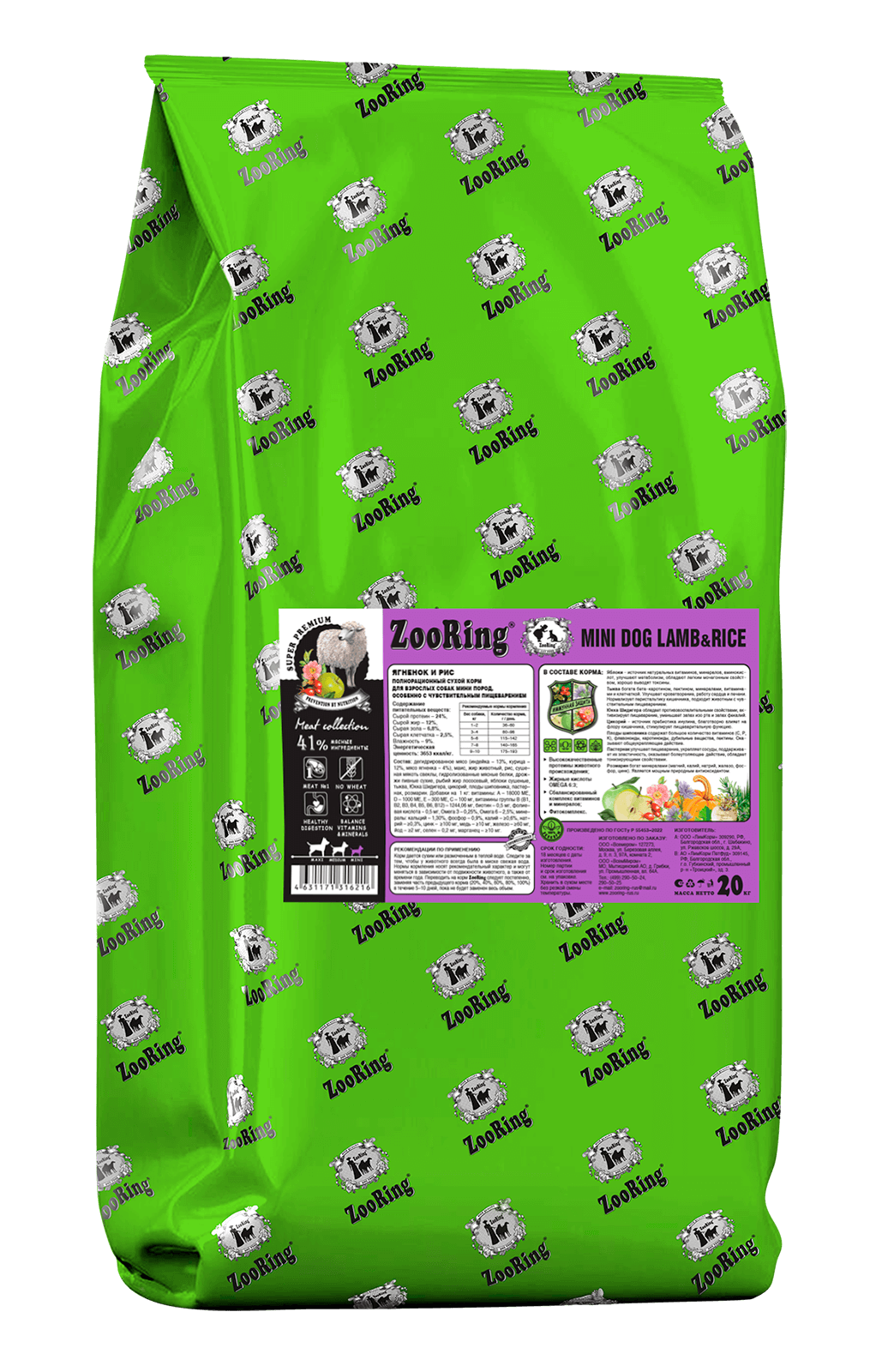 Состав: дегидрированное мясо (индейка – 13%, курица – 12%, мясо ягненка – 4%), маис, жир животный, рис, сушеная мякоть свеклы, гидролизованные мясные белки, дрожжи пивные сухие, рыбий жир лососевый, яблоки сушеные, тыква, Юкка Шидигера, цикорий, плоды шиповника, пастернак, розмарин.
